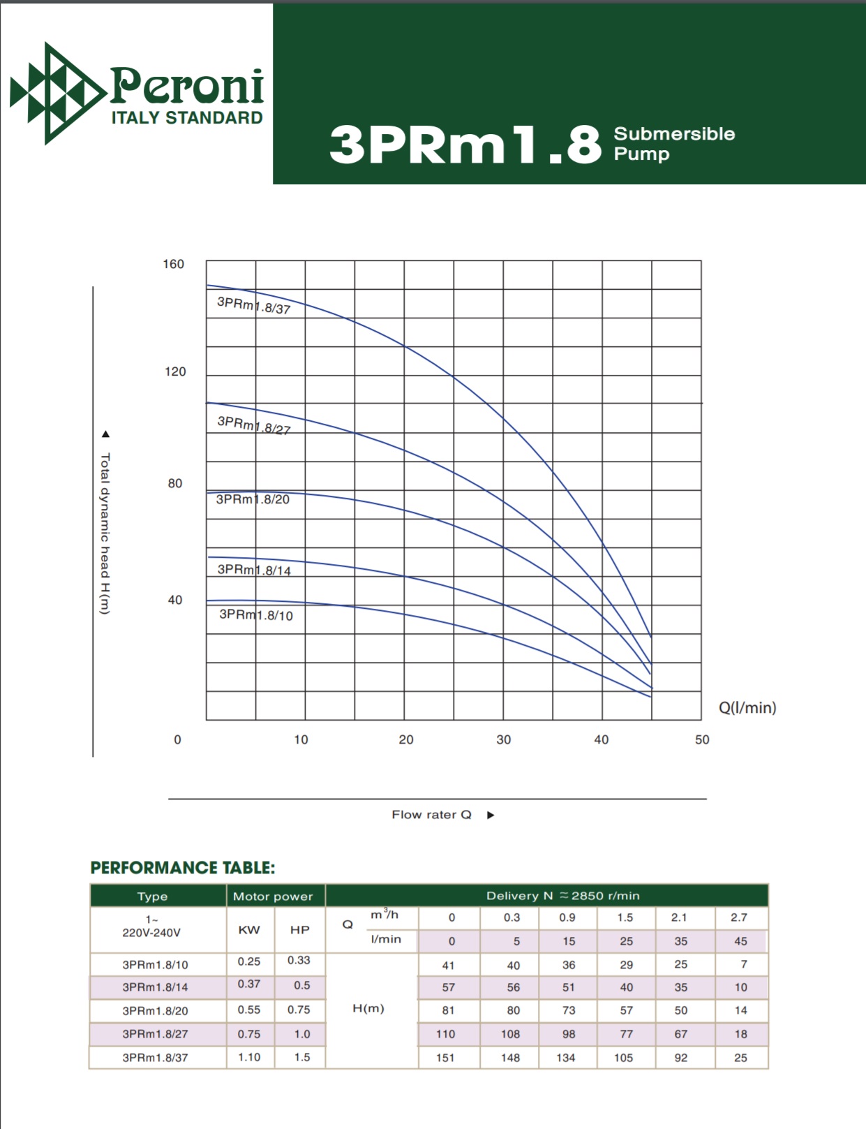 Bơm chìm giếng khoan Peroni Model 3PRm1.8/20 0.55Kw